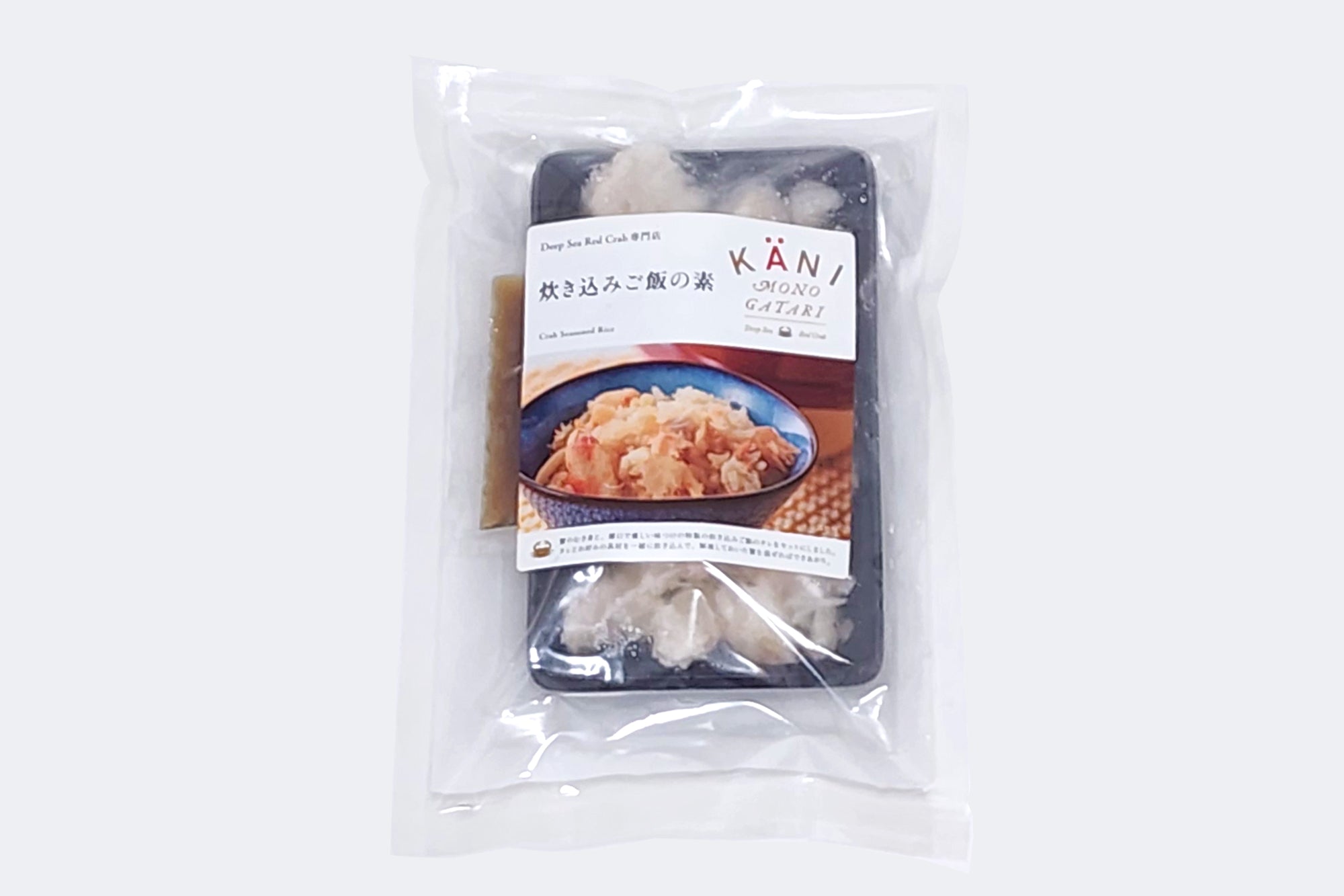 蟹の剥き身と、薄口で優しい味つけが自慢の特製の炊き込みご飯のタレをセットにしました。剥き身を解凍し、その時に出るドリップと付属のタレ、お米と水、お好みでその他の具材(たけのこや人参など)を一緒に炊き込むだけ。炊きあがったあとに解凍しておいた蟹を混ぜればできあがり。