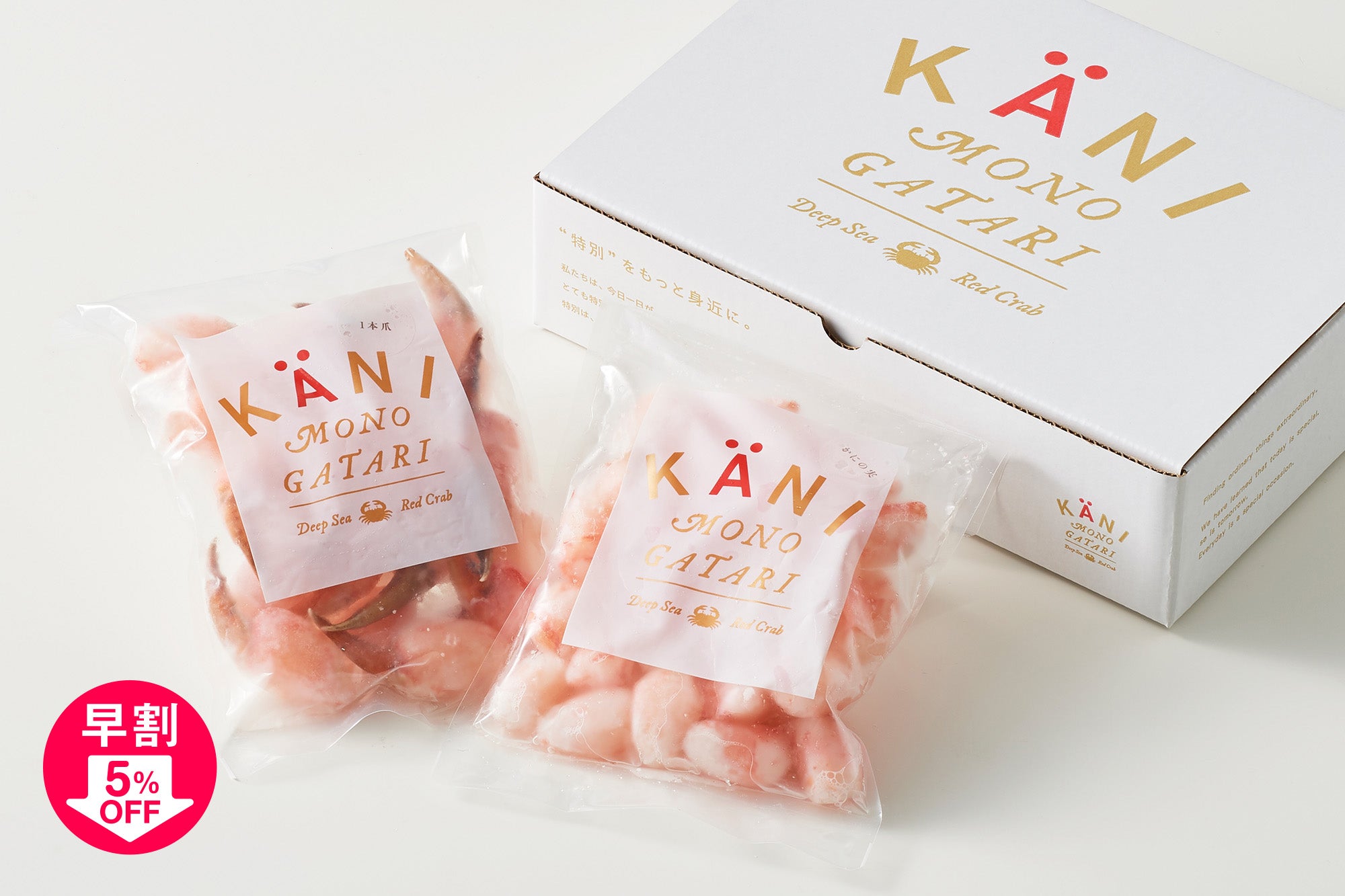もっとも身がしまっている部位“蟹爪”の爪を一本だけ残した「一本爪」と、蟹爪の付け根の部分“爪下”の殻を全て剥いた「かにの実」。貴重な蟹爪の2部位の食べ比べセットです。
