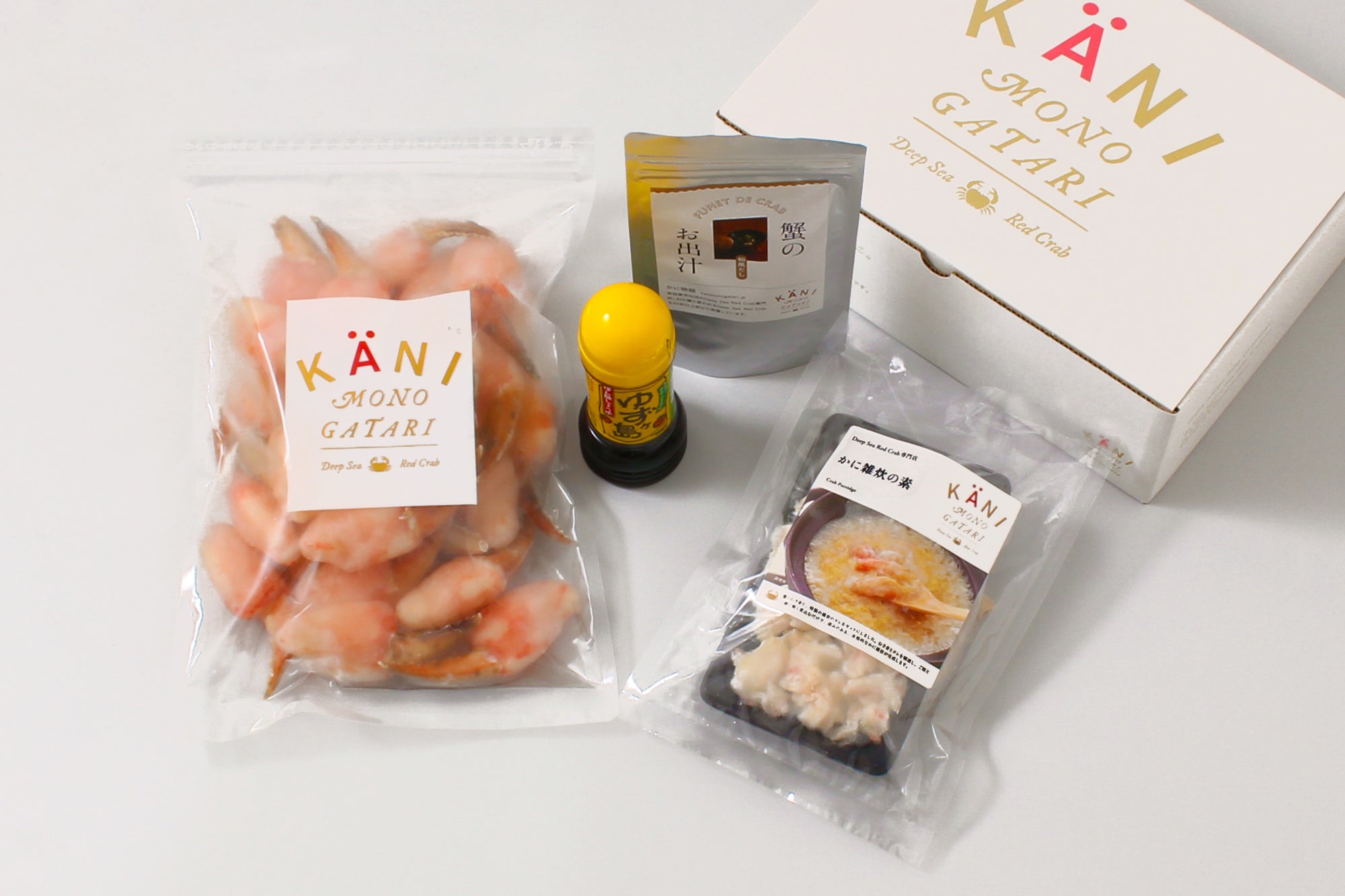 〆まで楽しんでいただけるように、蟹の剥き身とタレがセットになった「かに雑炊の素」と、ゆず香るポン酢しょうゆ「ゆずヶ島」も一緒にお届けします。
